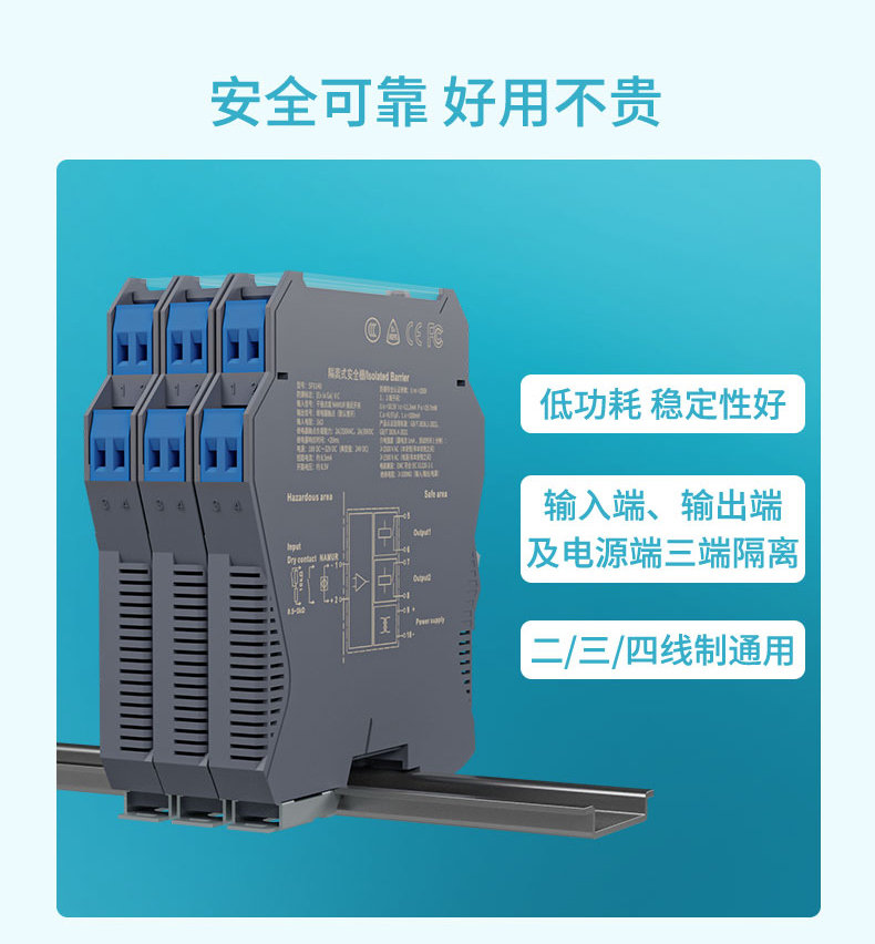 適用場合:本產(chǎn)品將來自危險區(qū)的開關(guān)量(干接點或接近開關(guān))信號,經(jīng)隔離轉(zhuǎn)換為繼電器觸點信號輸出到安全區(qū)。可通過撥碼開關(guān)設置輸入輸出正反相功能、第二路輸出功能(作為繼電器觸點輸出或作為故障信號輸出)及輸入線路監(jiān)測功能。輸入端、輸出端及電源端三端隔離。本產(chǎn)品為模擬化設計,具有可靠性高、響應快等諸多優(yōu)點??膳c各類儀表及 DCS、PLC 配套使用。