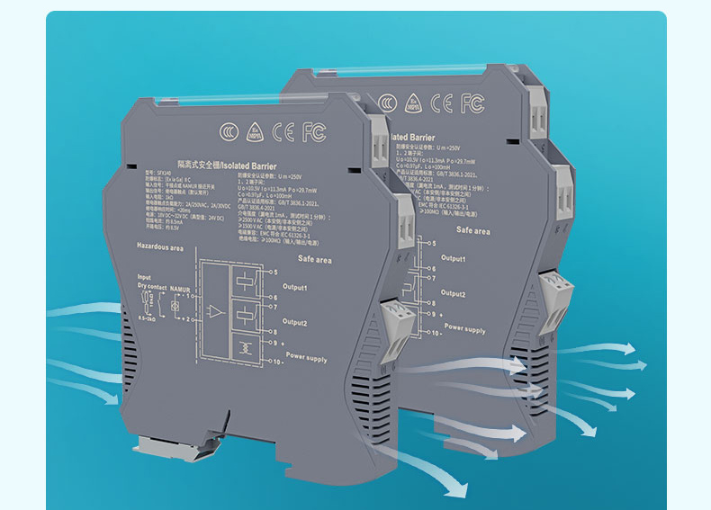 適用場(chǎng)合:本產(chǎn)生是通過(guò)干接點(diǎn)、集電極開(kāi)路信號(hào)控制輸出,驅(qū)動(dòng)危險(xiǎn)區(qū)的本安小功率設(shè)備。如電磁閥、聲光報(bào)警器等本安設(shè)備。輸入端、輸出端及電源端三方隔離。本產(chǎn)品具有可靠性高、響應(yīng)快等諸多優(yōu)點(diǎn)。可與各類儀表及 DCS、PLC 配套使用。